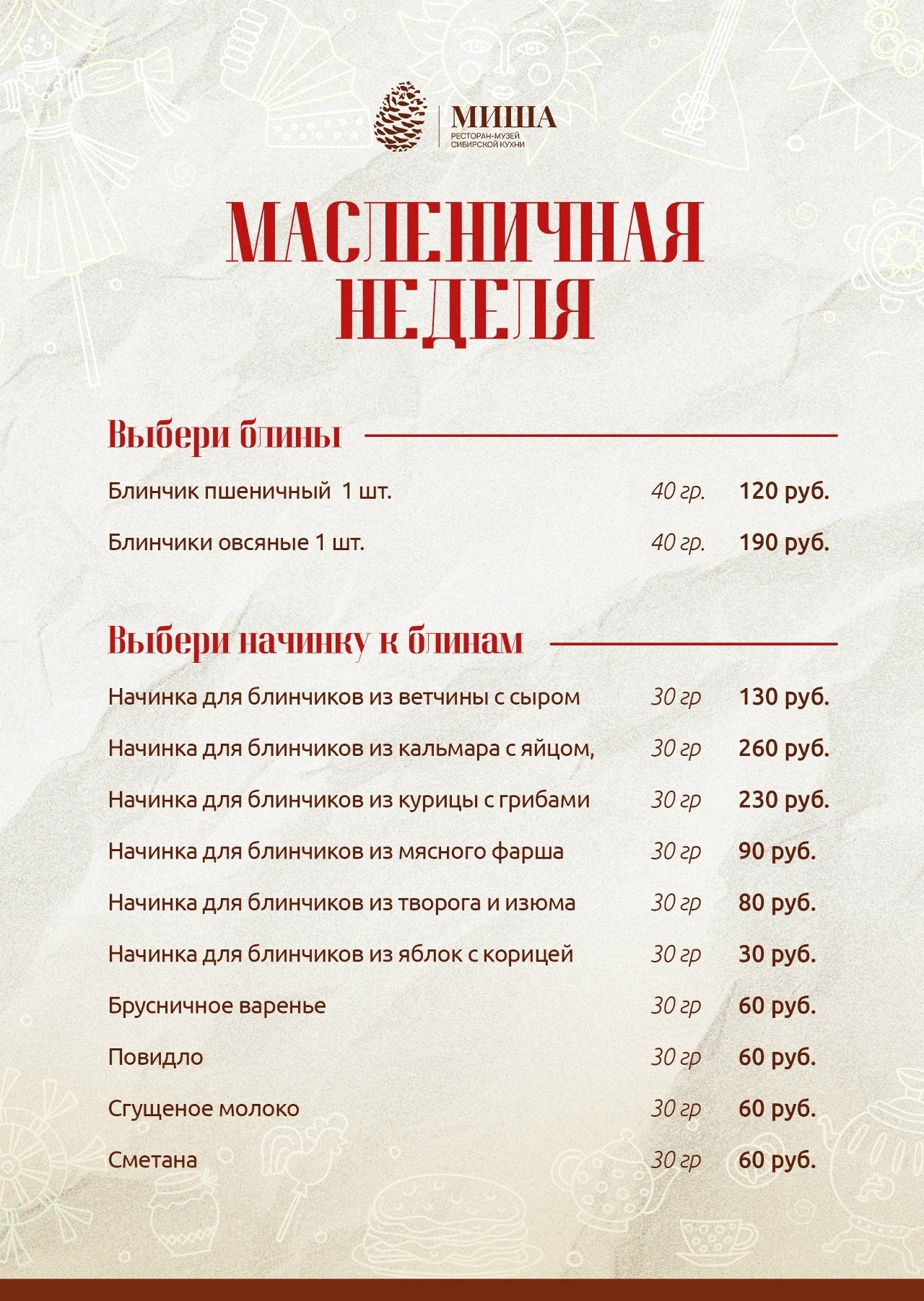 Всю неделю в нашем ресторане вы можете заказать вкусные угощения, и блины из нашего специального меню: